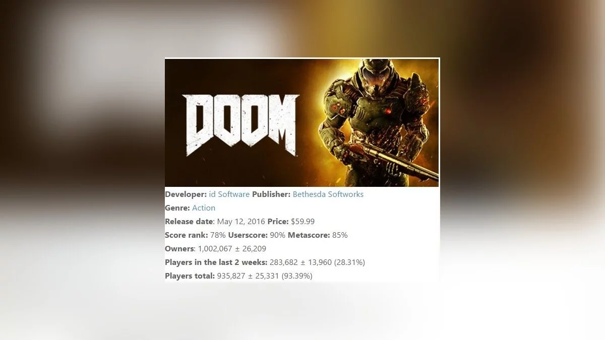 Ностальгическая DOOM производства id Software вышла три месяца назад, и, согласно данным сервиса SteamSpy, разошлась миллионным тиражом в сервисе цифровой дистрибуции Steam.