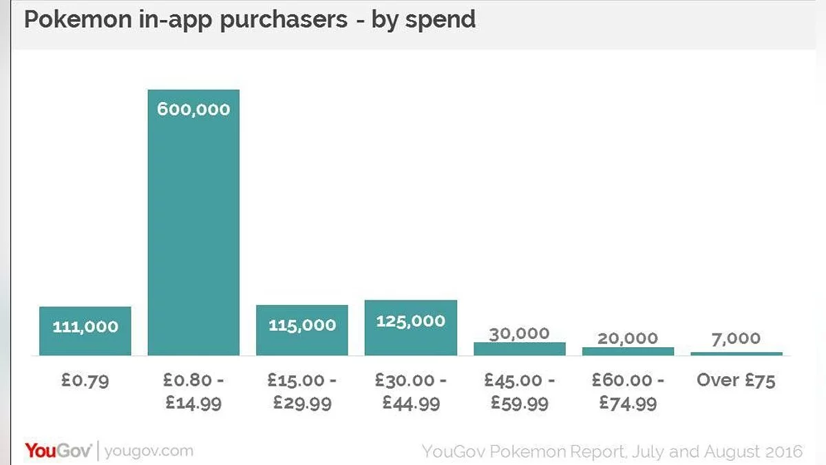Согласно статистике, около 600 000 человек потратили на Pokemon GO от 0,8 фунта до 15 фунтов (иначе говоря, от 1 $ до 20 $), и всего 7 000 пользователей вложили в игру более 75 фунтов (около 100 $).