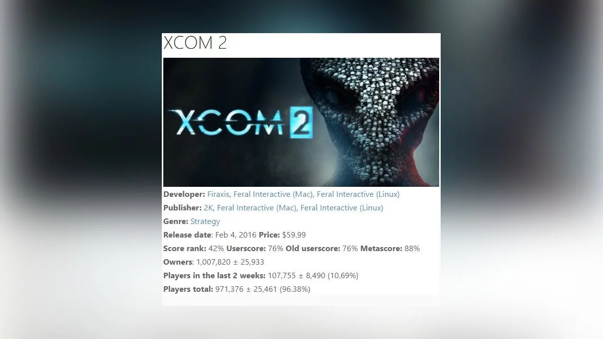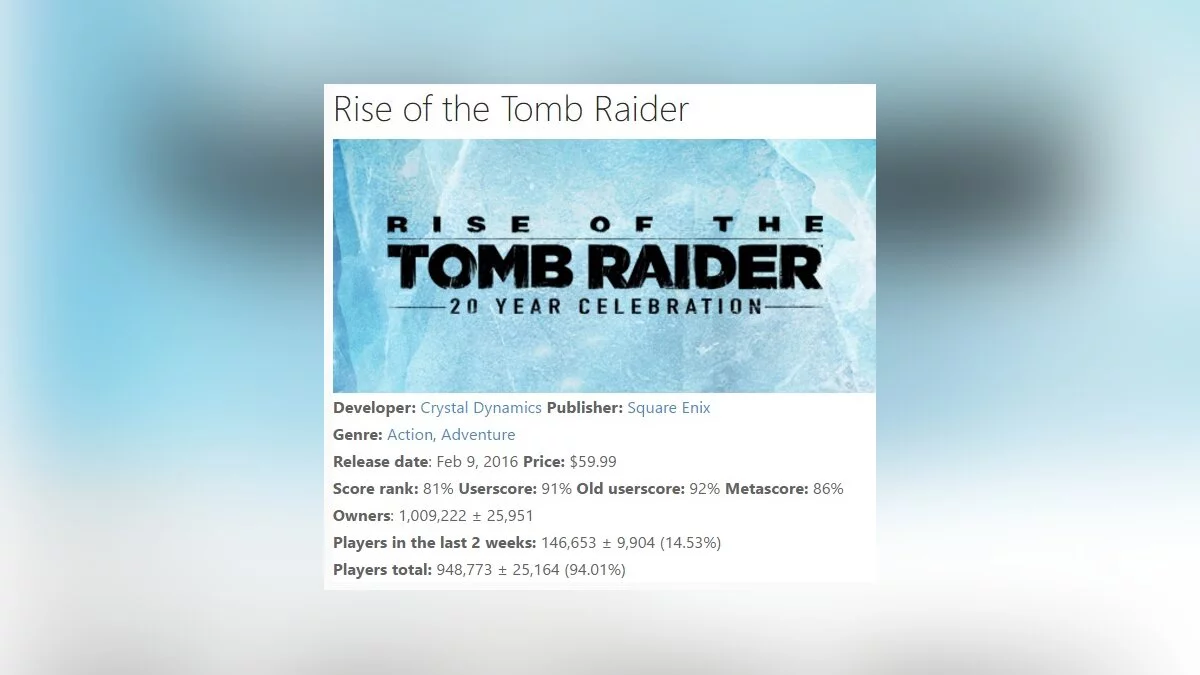 Согласно информации Steamspy, продажи Rise of the Tomb Raider и XCOM 2 наконец-то перевалили за миллионный рубеж. Обе игры вышли в феврале 2016 года, что значит, им потребовалось около восьми месяцев для того, чтобы распространиться по всему миру огромным тиражом.