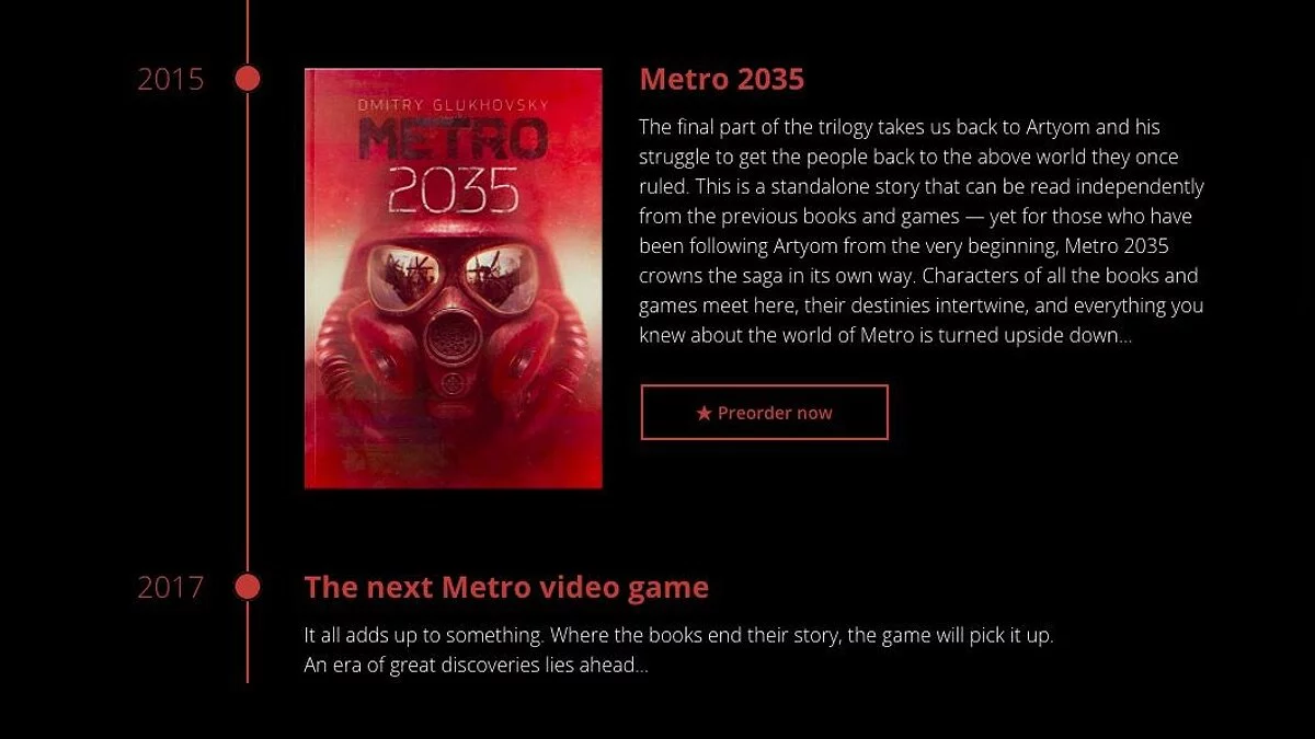 Недавно официальный сайт книжной серии «Метро» обновился в честь открытия предзаказов на английскую версию романа Дмитрий Глуховского «Метро 2035». Однако одной только информацией о книге автор не ограничился — на том же сайте был обнаружен небольшой тизер следующей игры в данной вселенной.