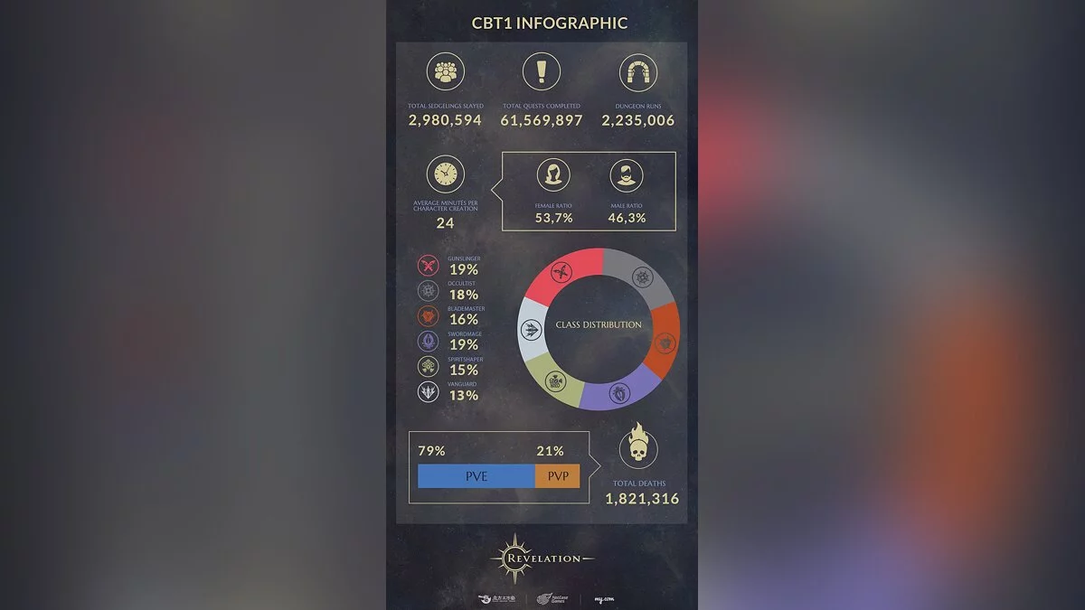 Первый раунд закрытого тестирования Revelation Online закончился 17 ноября 2016 года. Студия My.com выложила инфографику по этому поводу. Более 2,2 миллионов рейдов было проведено за время беты. Выполнено более 61,5 миллионов квестов. Женщин в игре чуть больше, чем мужчин.