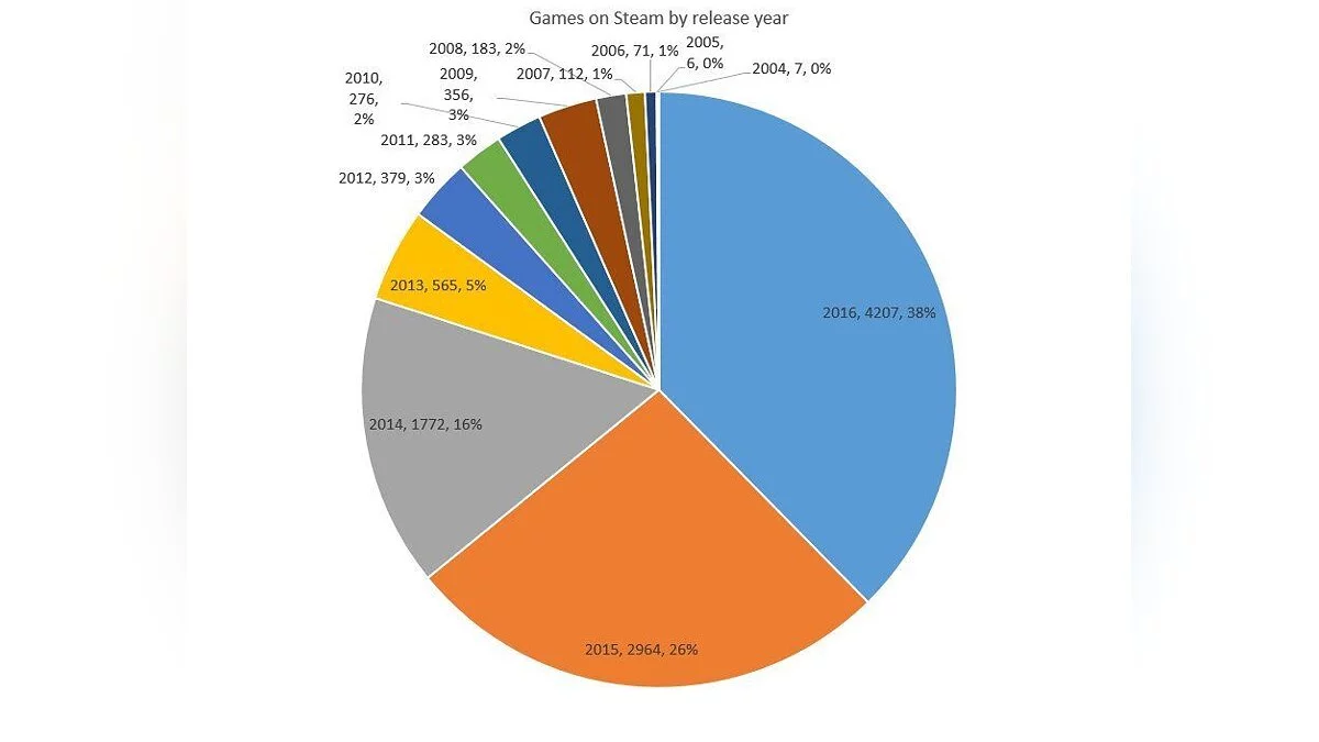 Совсем недавно Steam Spy опубликовал в Twitter шокирующие данные о выходе игр в сервисе Steam, которые удалось получить благодаря Steam API. По данной информации, 38 % продуктов из всего количества игр в Steam вышли в 2016 году. Это значит, что за этот год в сервисе от Valve появилось больше игр, чем за десять лет — с 2004 по 2014 год.