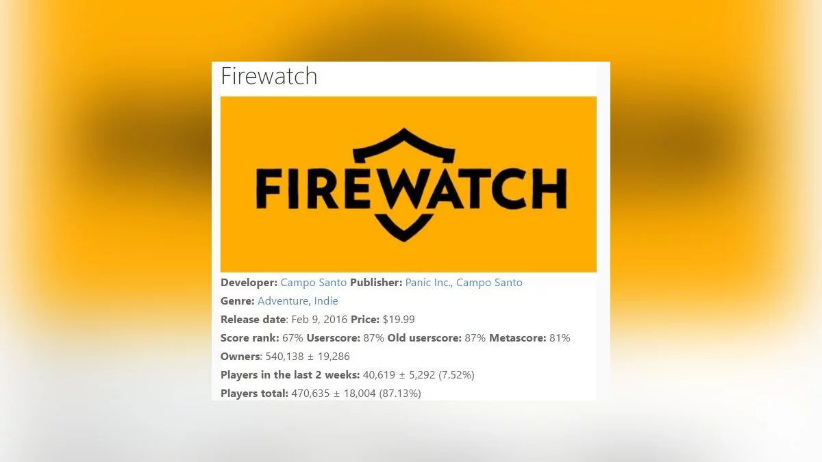 Что еще более интересно, согласно статистике Steam Spy, половина проданных копий должна приходиться на РС-версию Firewatch: