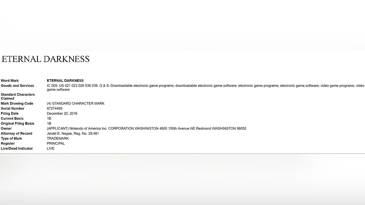 Информация об этом пришла из организации по патентам и торговым маркам США (US PTO), где была обновлена информация относительно Eternal Darkness. Есть два интересных момента. Первый — Nintendo решила перерегистрировать права на эту торговую марку, вместо того чтобы просто продлить их. Второй — все это происходит накануне презентации следующей консоли компании Switch, которая состоится через две недели.