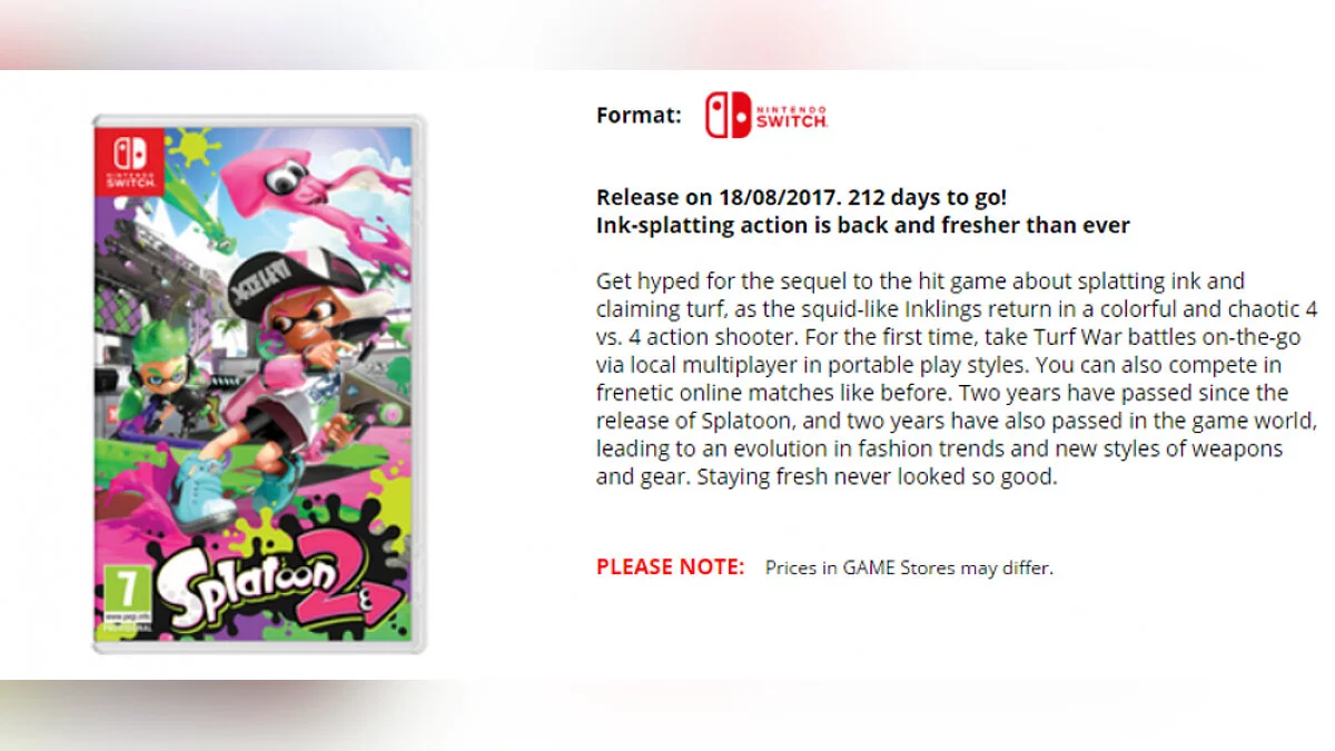 Во время анонса Splatoon 2 представители Nintendo говорили, что проект выйдет летом 2017 года и эта дата отлично вписывается в указанное ими релизное окно. В ней можно быть уверенными на 90 %, поскольку GAME является крупнейшим магазином видеоигр в Британии, то есть источник вполне авторитетен.