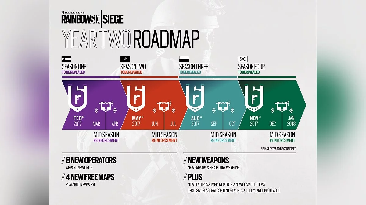Второй год поддержки Rainbow Six Siege также поделен на 4 сезона, в рамках которых Ubisoft добавит в игру новых оперативников, карты, а также разнообразные инструменты для кастомизации игроков, например, скины для оружия, шлемы и прочее. Помимо испанцев, нас ждут представители спецслужб из Гонконга, Польши и Южной Кореи. Кроме того, в середине каждого сезона разработчики будут выпускать крупные промежуточные обновления, вносящие изменения в баланс игры и исправляющие наиболее важные ошибки.