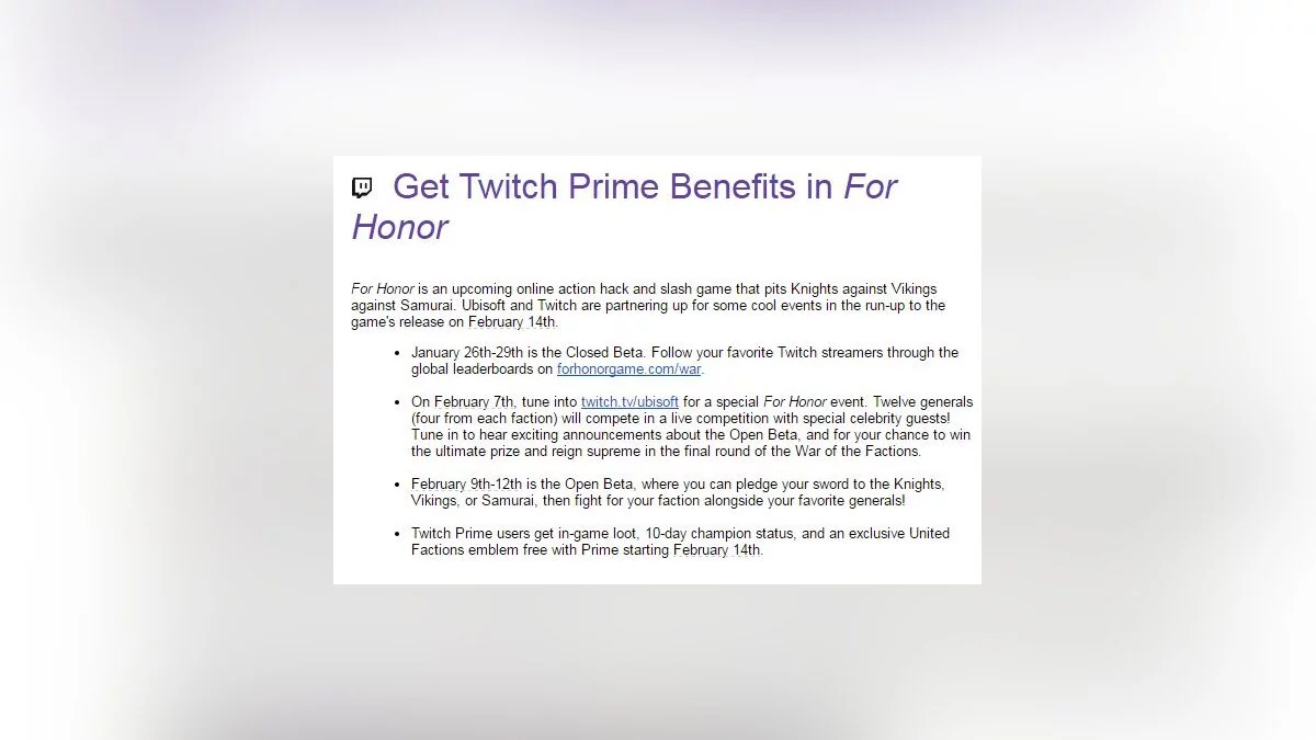 Стоит также отметить, что по информации от Strakt, в For Honor могут быть специальные бонусы для пользователей Twitch Prime — 10 дневный статус чемпиона, бонус к опыту и рейтингу и эксклюзивная эмблема.