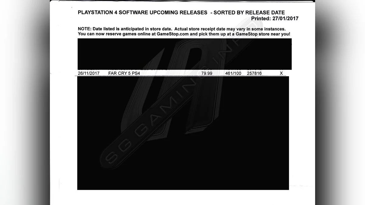 Также сотрудники SG Gaming позвонили в местный GameStop и процитировали код SKU. В ответ им подтвердили, что этот код прикреплен к Far Cry 5 и что игра должна выйти в магазине GameStop в конце ноября 2017 года. Дальнейшие обращения в GameStop не смогли добавить какую-то новую информацию.