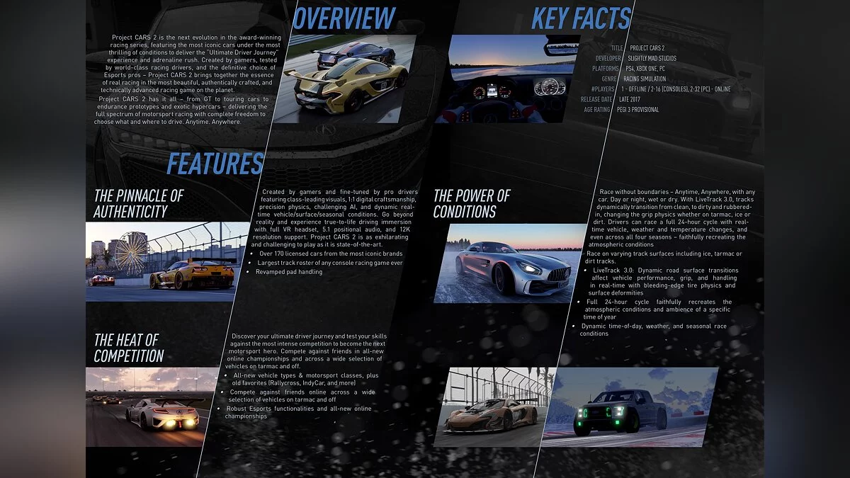 Project CARS 2 предложит набор из более чем 170 автомобилей и более 60 гоночных трасс, новый для серии режим «онлайн-чемпионат», страстно желаемый фанатами, а также дополнительные гоночные дисциплины на новых типах трасс: лед, грязь, дерн и снег.