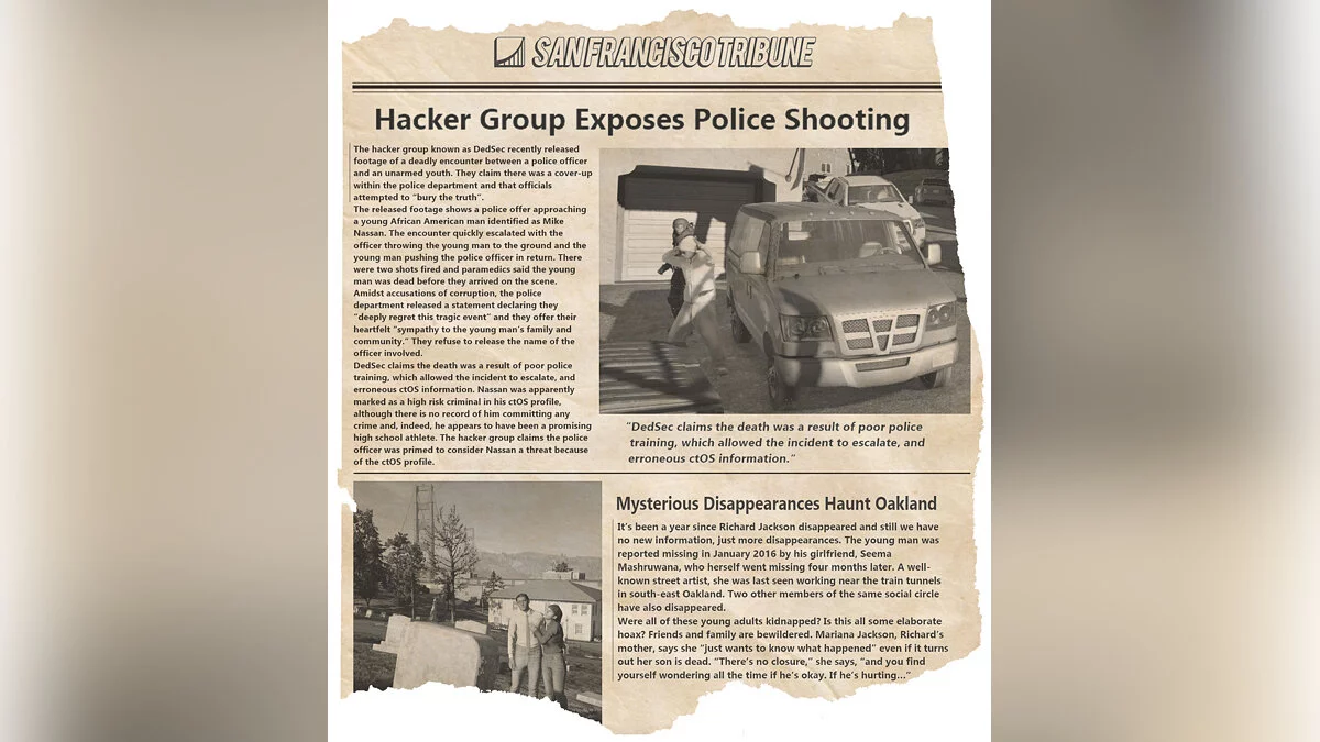 Пользователи Reddit впервые заметили новый контент после патча 1.1, когда NPC начинают диалог на тему четырех пропавших подростков. Подтверждая подозрения сообщества на тему того, что происходит что-то странное, официальный Tumblr-аккаунт Watch Dogs 2 начал кормить фанатов подсказками, например, такими: