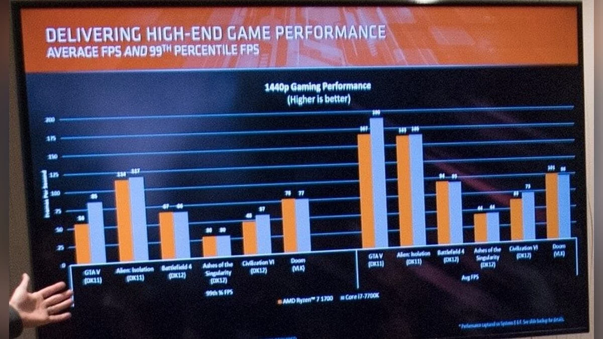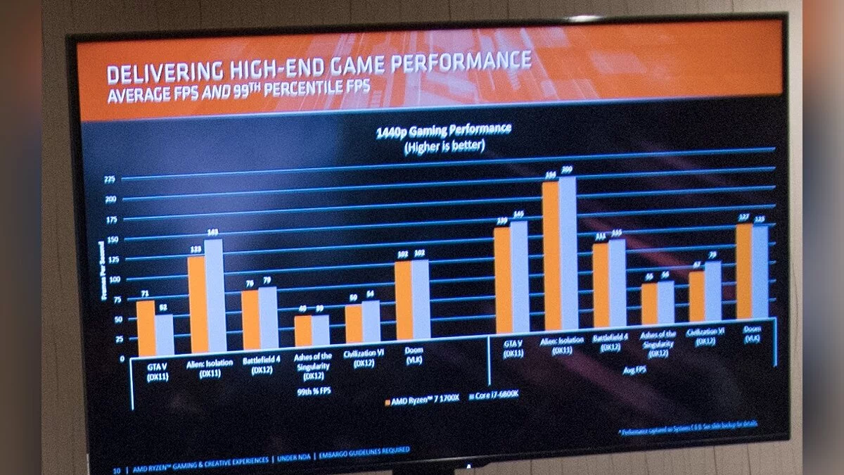 Компания AMD в рамках международной конференции GDC 2017 сделала несколько важных презентаций, но самое большое значение мы можем придать вчерашнему мероприятию, в рамках которого были представлены первые слайды с официальной производительностью процессоров новейшей архитектуры Zen, коммерческое название которых Ryzen, в играх.
