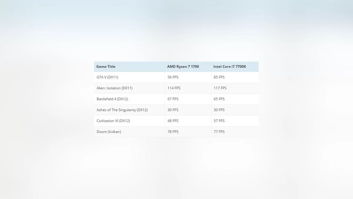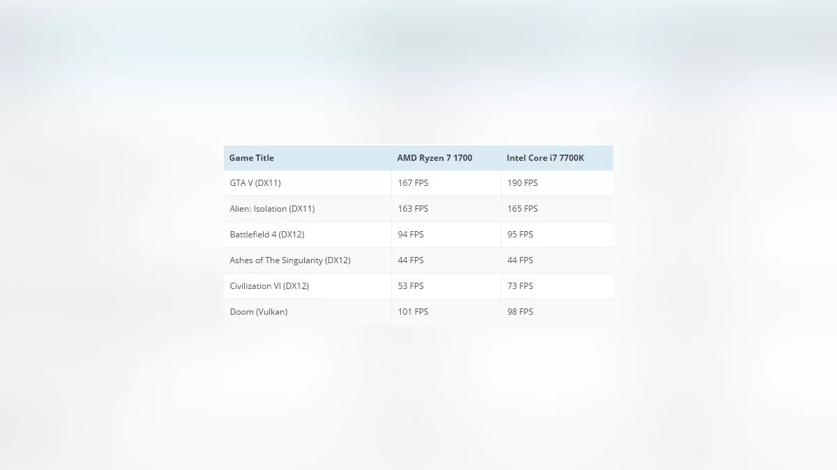 Для более простых геймеров AMD предлагает процессор Ryzen 7 1700 стоимостью 329 $, восьмиядерника с 16 потоками и тактовой частотой 3,0 ГГц (3,7 ГГц), который в следующем тесте был противопоставлен настоящему геймерскому процессору Core i7-7700K стоимостью 339 $, четырехядернику с 8 потоками и тактовой частотой 4,2 ГГц (4,5 ГГц):