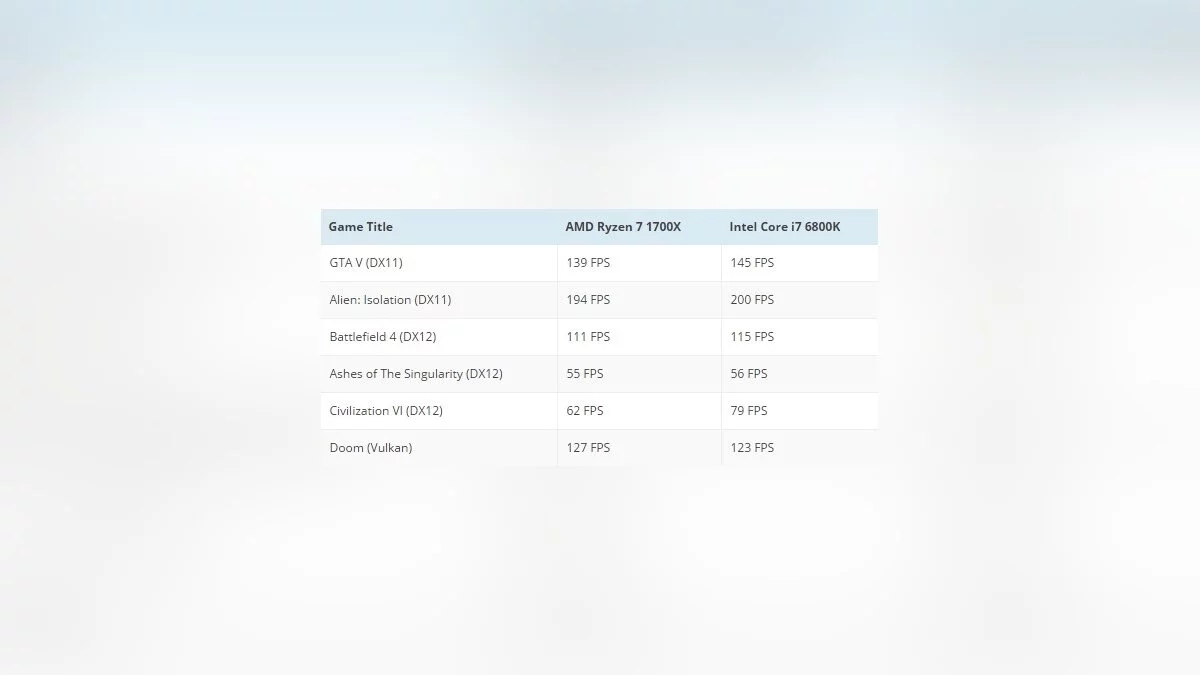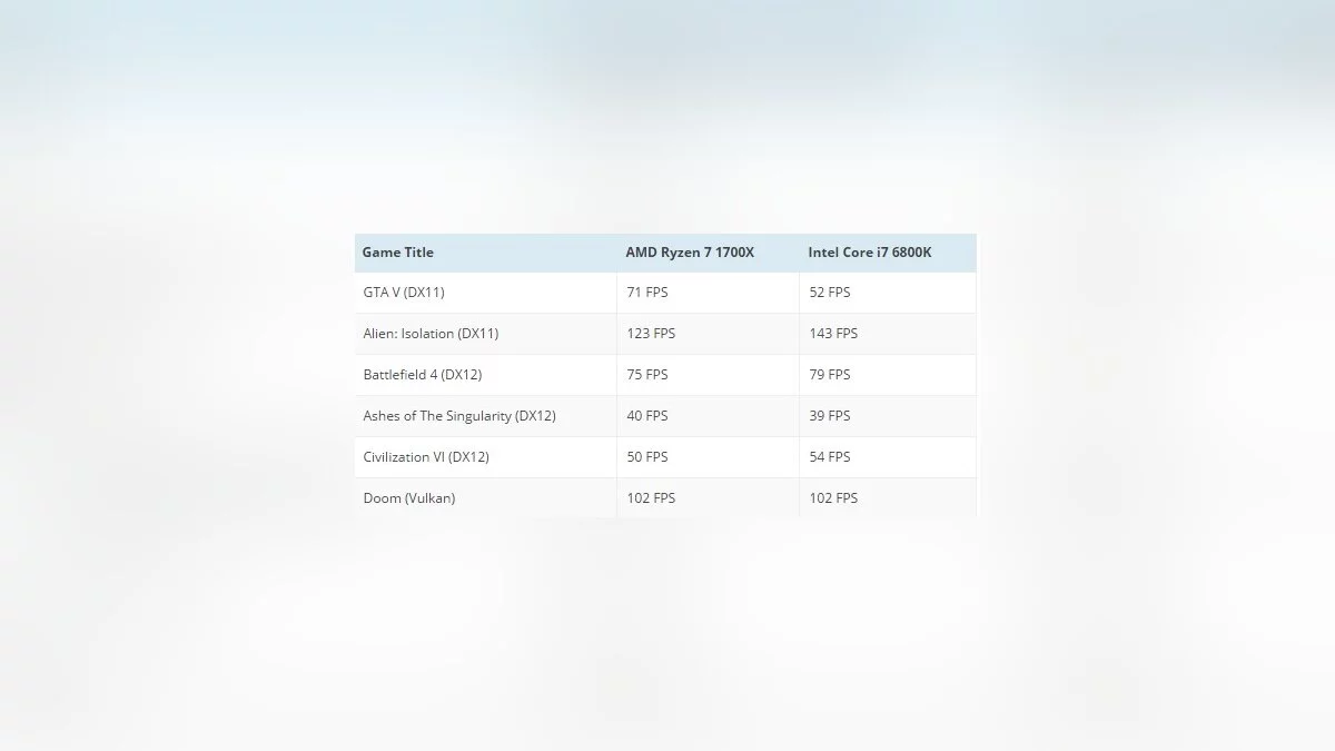 Здесь ситуация аналогична предыдущей, хотя в GTA 5 и Civilization 6 процессор от Intel серьезно вырвался вперед. Вот таблица для сравнения: