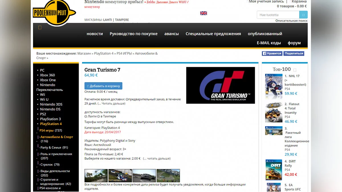 Интересную информацию сегодня обнаружили в сети. Если верить финской торговой сети Puolenkuun Pelit, Gran Turismo Sport может выйти уже через месяц.