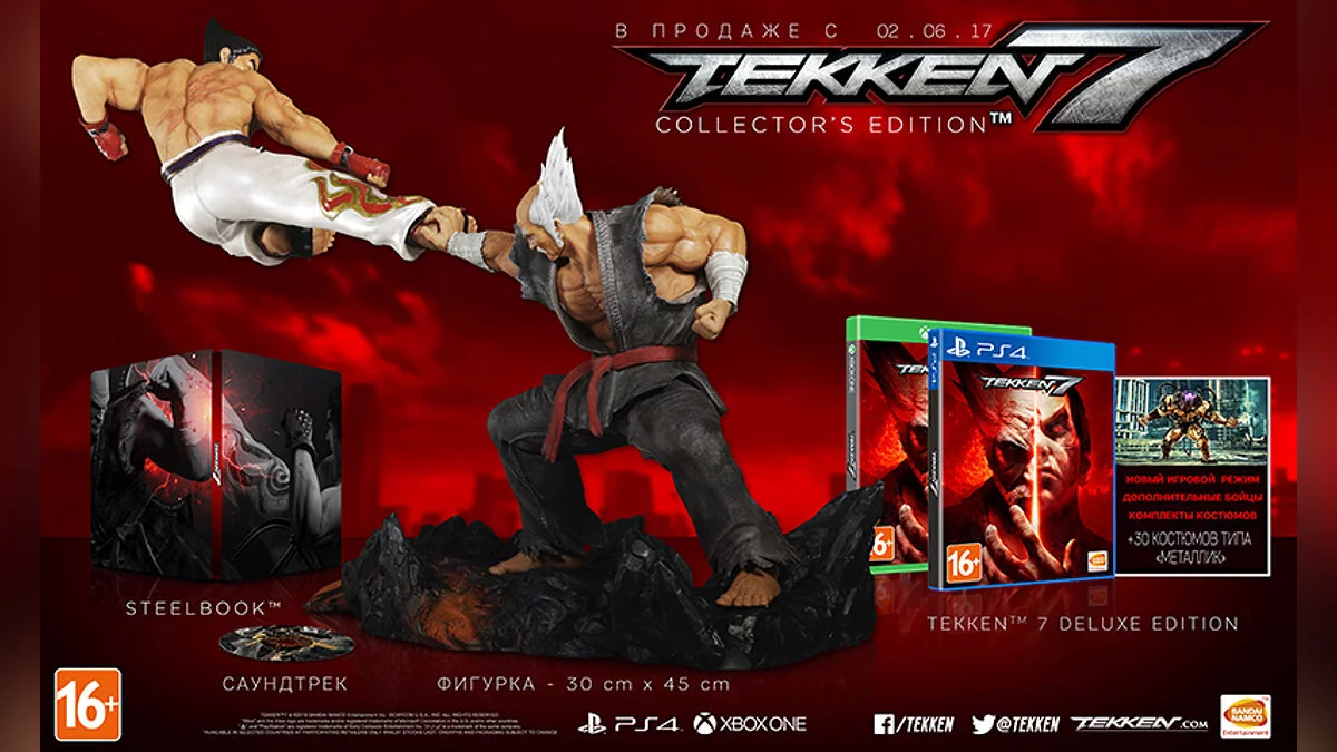 Данное издание доступно только для PS4 и Xbox One. Стоимость комплекта составляет 11999 рублей для обеих платформ.Еще с прошлого года Tekken 7 была доступна в Японии на аркадных автоматах, однако перед релизом для новых платформ игра получила большое количество улучшений и обновлений, в число которых вошли новые возможности кастомизации персонажей и уровней, добавление новых героев, например, Акумы из серии Street Fighter, так и удаление некоторых — в этой части файтинга мы не увидим боксирующего кенгуру Роджера.