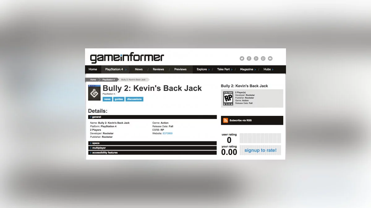 На удаленной странице было указано, что игра называется Bully 2: Kevin's Back Jack, поддерживает режим на 2 игроков, и выйдет на PlayStation 4 уже этой осенью. В любом случае выставка E3 2017 уже совсем скоро, а поэтому ждать осталось недолго, чтобы узнать, действительно ли Rockstar Games работает над данной игрой.