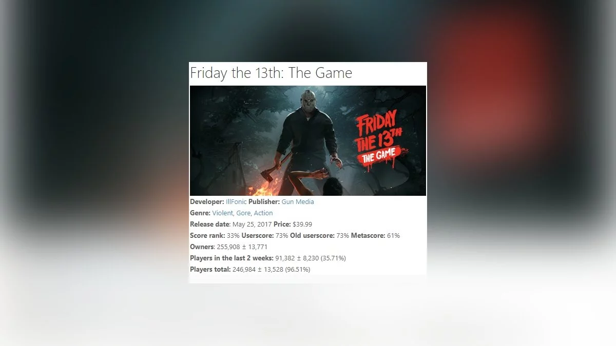 Совсем недавно компания Gun Media объявила, что продала 1,8 млн. копий сетевого хоррора на выживание от третьего лица Friday the 13th: The Game. Примечательно, что такого результата разработчики достигли всего за два месяца после релиза — игра вышла 26 мая на PC, PlayStation 4 и Xbox One.