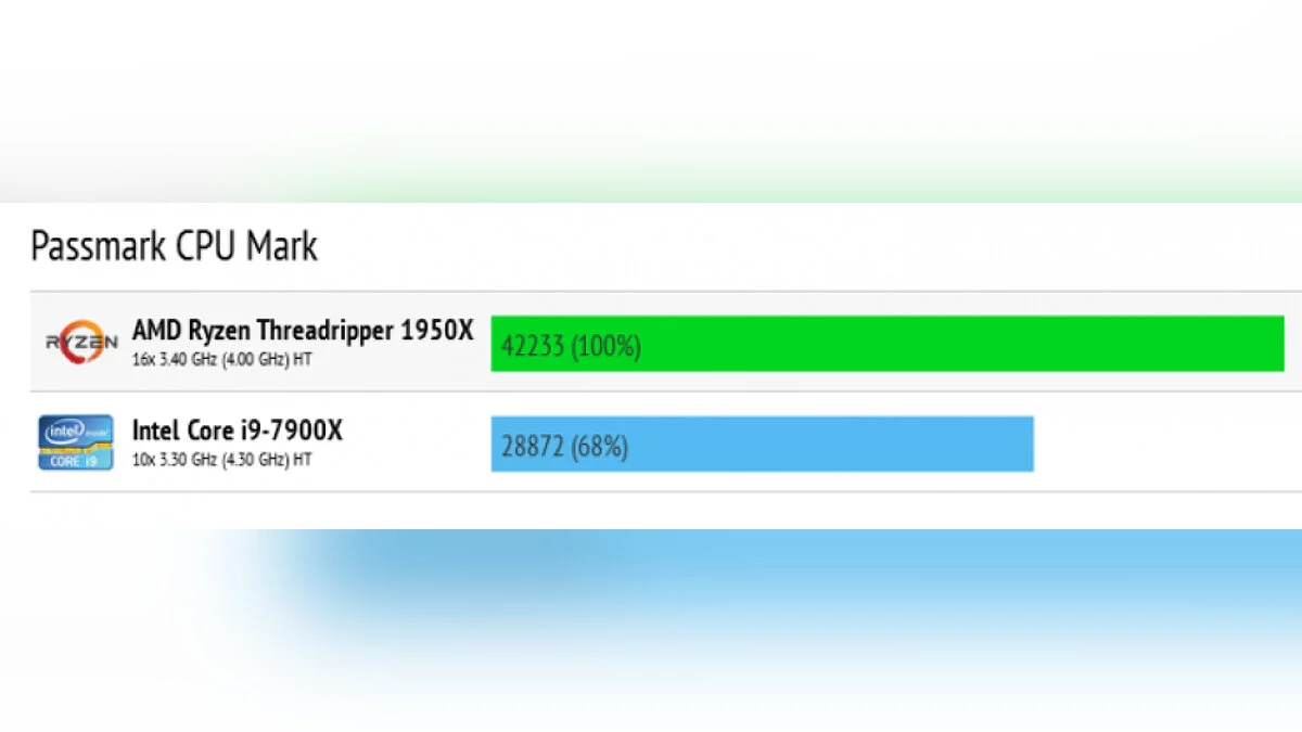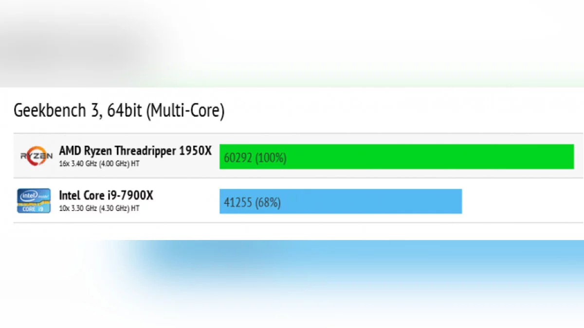 Согласно данным бенчмарка, процессор AMD Ryzen Threadripper 1950X оказывается на 45% быстрее Intel Core i9-7900X. Ознакомиться с данными можно ниже: