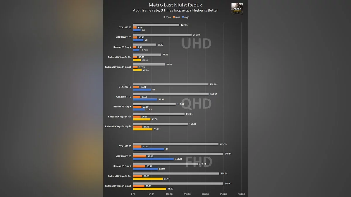 В тестировании принимали участие две версии RX Vega 64: с воздушным охлаждением и с водяным. Видеокарта тестировалась в следующих играх: Battlefield 1, Ghost Recon: Wildlands, Titanfall 2, Metro: Last Light Redux и Civilization 6. Кроме того, были проведены тесты в 3DMark Firestrike и 3DMark TimeSpy. Тестирование проводилось в разрешениях 1080р, 1440р и 4К.