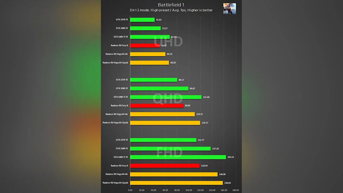 Как можно видеть, производительность AMD RX Vega 64 находится на уровне GTX1080. Стоит заметить, что в DX12 ситуация может измениться в пользу видеокарты от AMD.