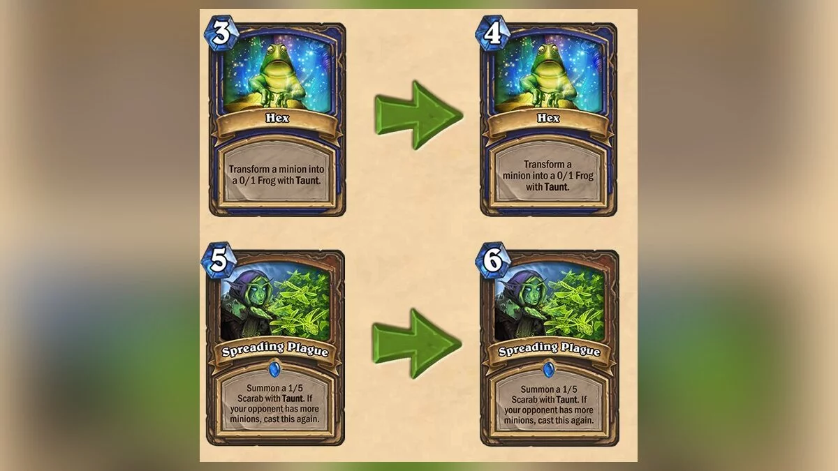 Наконец, была увеличена стоимость базовой карты шамана «Сглаз» (Hex) с 3 до 4 маны. Разработчики объяснили данный нерф тем, что у каждого класса должны быть как сильные, так и слабые стороны, а по их мнению, шаман был относительно лишен последних в схватках с большими существами.