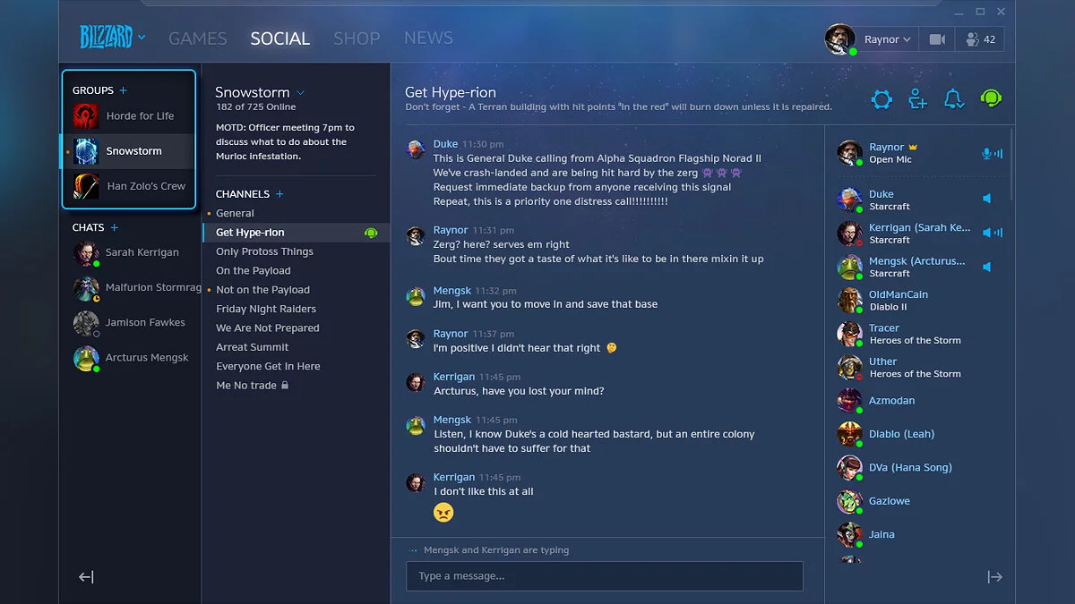 Пользователи Battle.net отныне могут отправлять сообщения своим друзьям даже в автономном режиме. Групповые чаты, включающие в себя текстовые и голосовые каналы, нацелены объединить геймеров по интересам, сделав общение между собой более удобным. Пользователи получили доступ к администрированию своих групп, благодаря чему могут добавлять новых участников и управлять социальными элементами.