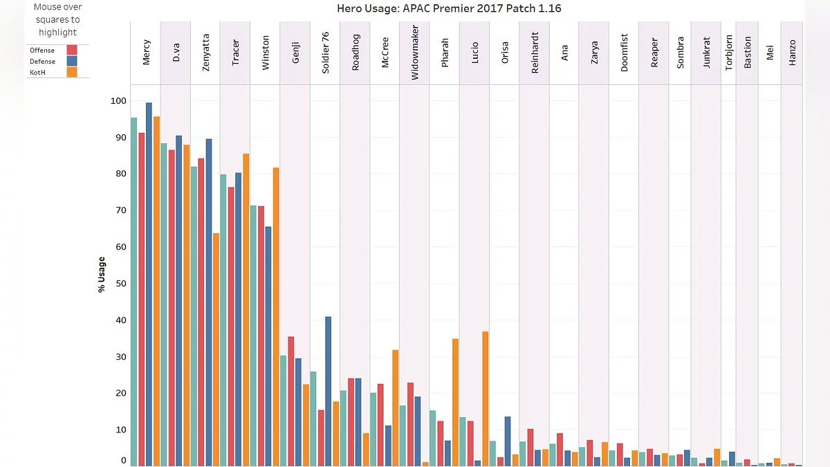 В первую тройку самых популярных героев входят Ангел (ее выбирают в более, чем 95 % игр), D.Va и Дзенъятта (популярность более 80 %). Лусио в свою очередь скатился до 13 %, став в один ряд с такими персонажами, как Роковая вдова, Ана, Рейнхардт, Заря, Фарра и Ориса.