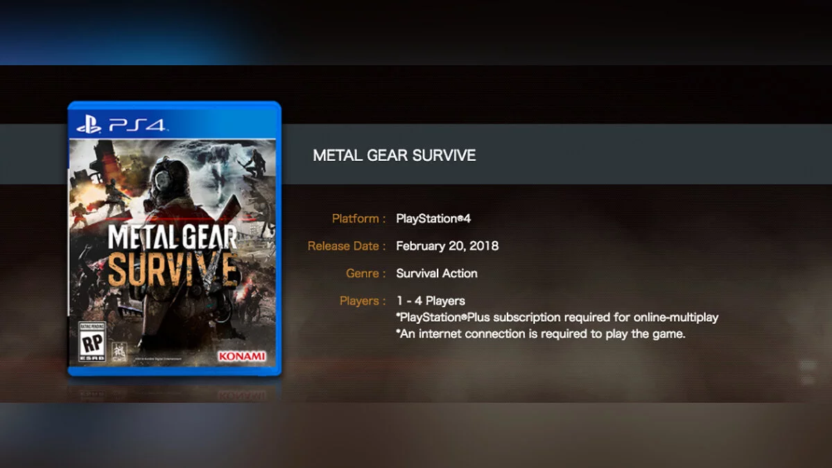 Если зайти на страницу игры Metal Gear Survive, то можно увидеть, что на обложке для каждой версии, включая PC, PS4 и Xbox One указано следующее: «для игры требуется интернет-соединение». Кроме того, для мультиплеера геймерам на PS4 и Xbox One потребуется подписка PS Plus и Xbox Live Gold.