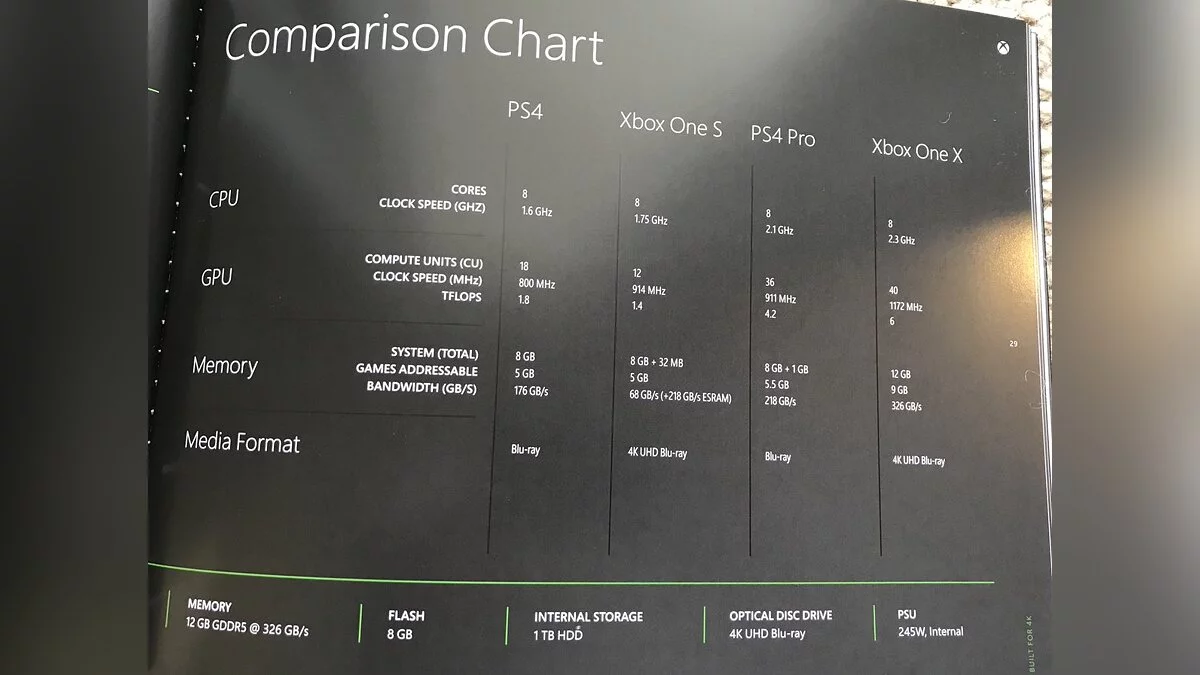 Microsoft положила рекламный буклет в коробки с Xbox One X, которые отправила игровым изданиями для обзоров. В этой промо-книжке содержится сравнительная таблица Xbox One X с Xbox One S, PlayStation 4 и PlayStation 4 Pro.