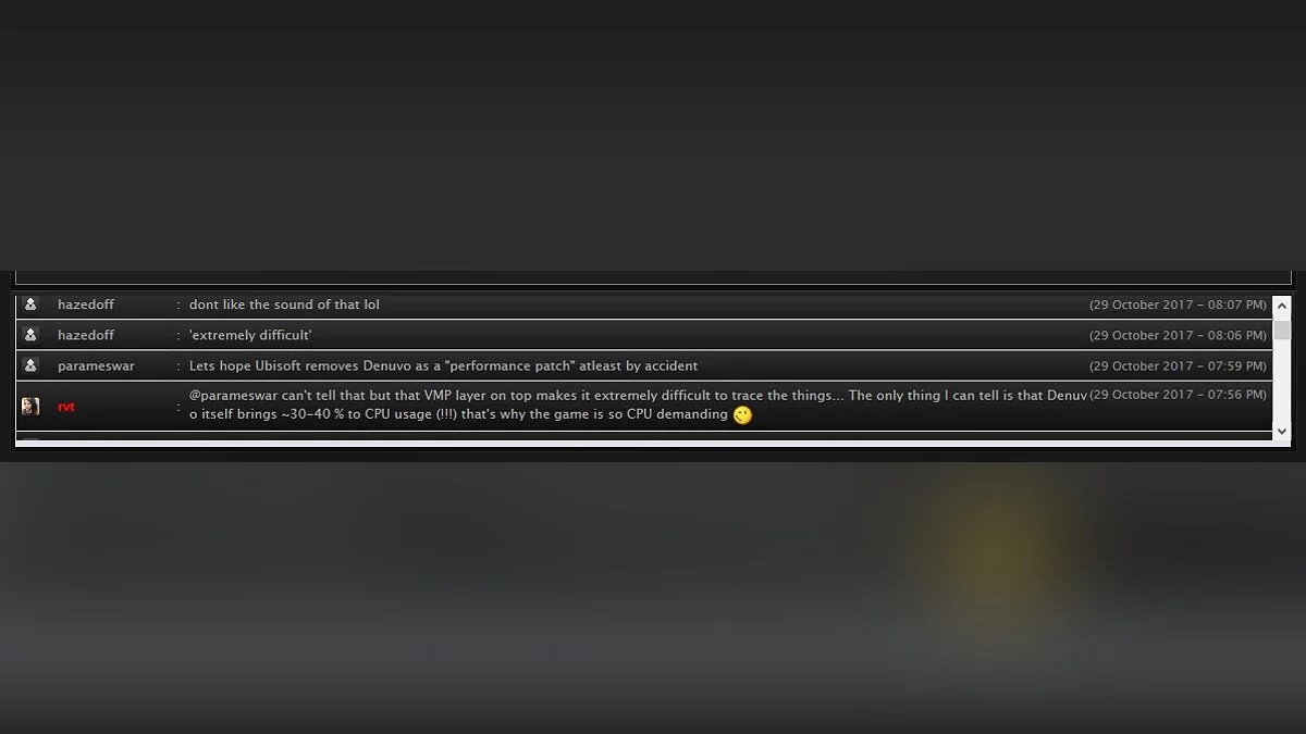 По словам хакеров из группы Revolt, Ubisoft добавила в Assassin's Creed: Origins не только Denuvo, но и защиту VMProtect, чтобы обезопасить игру от взлома. Однако из-за вышеперечисленных технологий, игра дополнительно нагружает процессор на 30-40 %.