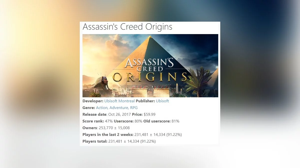 Сейчас очень интересно, удастся ли Ubisoft продать миллион копий Assassin's Creed: Origins в Steam. Единственными играми, которые достигли данного результата, являются Assassin's Creed 2, Assassin's Creed 3 и Assassin's Creed: Black Flag.