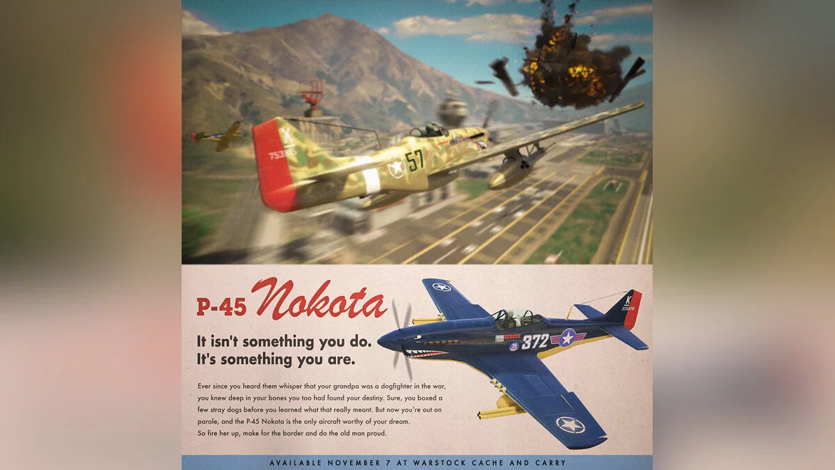 Новым транспортом, добавленным в GTA Online, является олдскульный самолет P-45 Nokota, который продается на сайте Warstock Cache & Carry. Что касается режима «Воздушная схватка», он представляет собой серию дуэлей на боевых самолетах один на один. До 13 ноября за участие в данном режиме геймеры будут получать удвоенное количество GTA $ и RP.