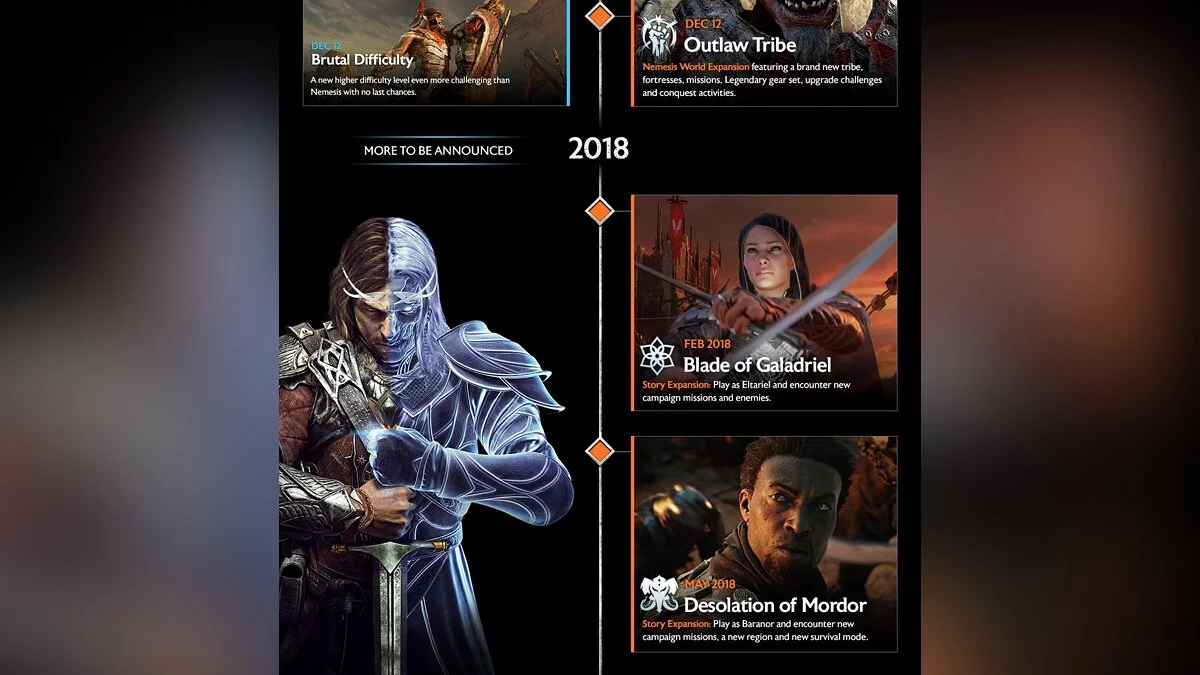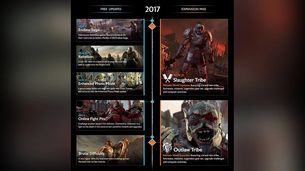 Warner Bros. анонсировала несколько бесплатных контентных обновлений для Middle-earth: Shadow of War, которые выйдут до конца года. Согласно пресс-релизу, игроков ждёт новый энд-гейм контент и цели продолжать битву за Мордор.