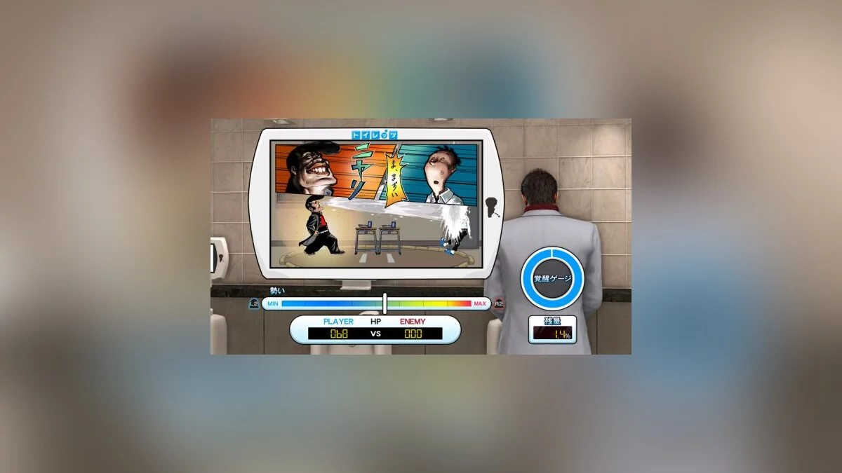 Герой Yakuza: Kiwami 2 сможет есть и пить, а, соответственно, и в туалет он должен ходить. Как только вы накопите нужное количество «туалетных очков», бегите в ближайшую уборную. Там вы сможете поиграть в тайтлы, выпущенные Sega, например, в «Splash Battle! Milk from the Nose» и «The North Wind, the Sun, and Me».
