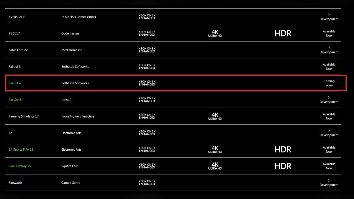 Ролевый шутер Fallout 4 в ближайшее время должен получить патч, который улучшит производительность игры на Xbox One X, так как Microsoft добавила его в расширенный список для своей новой консоли.