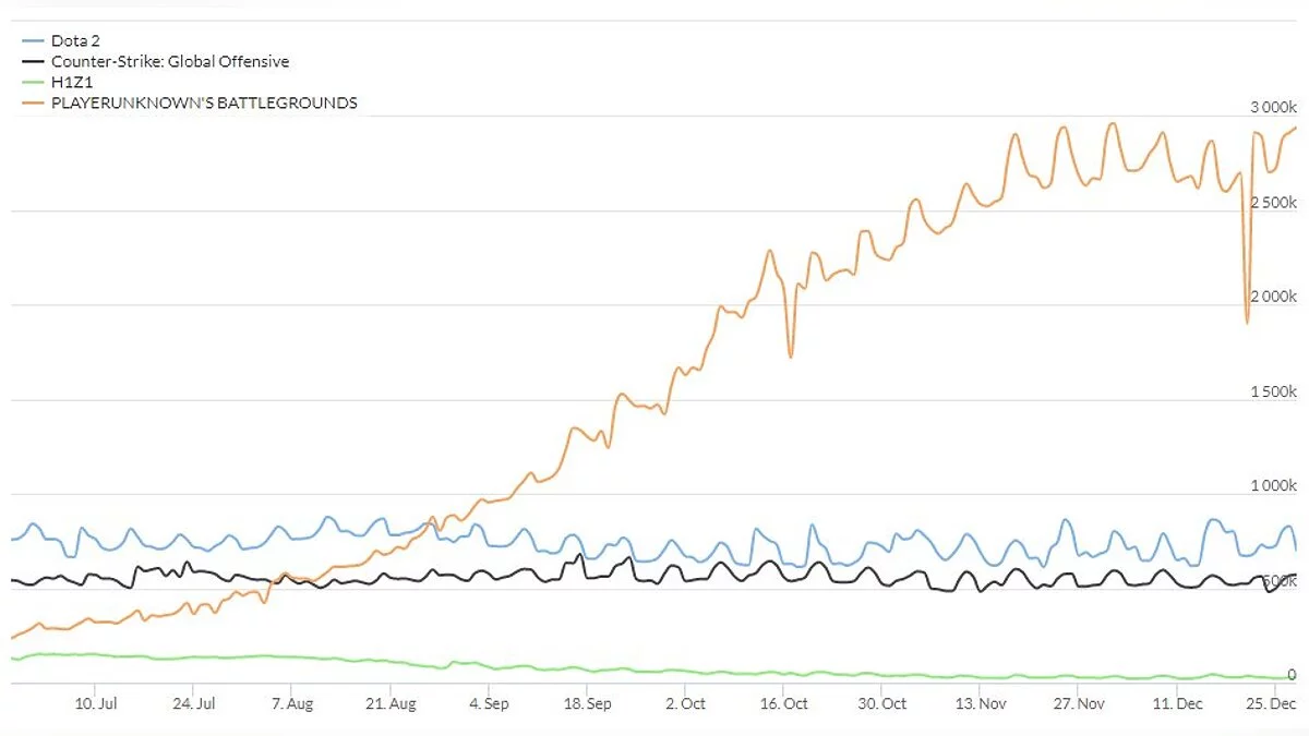 Steam Database также опубликовал график, который показывает рост PUBG в сравнении с другими популярными играми Steam.