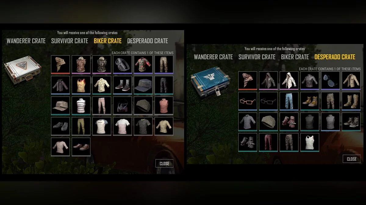 Вышеупомянутые костюмы можно получить, собрав их части из ящиков. Если вы находитесь на тестовом сервере, вам будут предоставлены ключи и боевые очки для доступа к сундукам (байкер, головорез, странник, выживший).