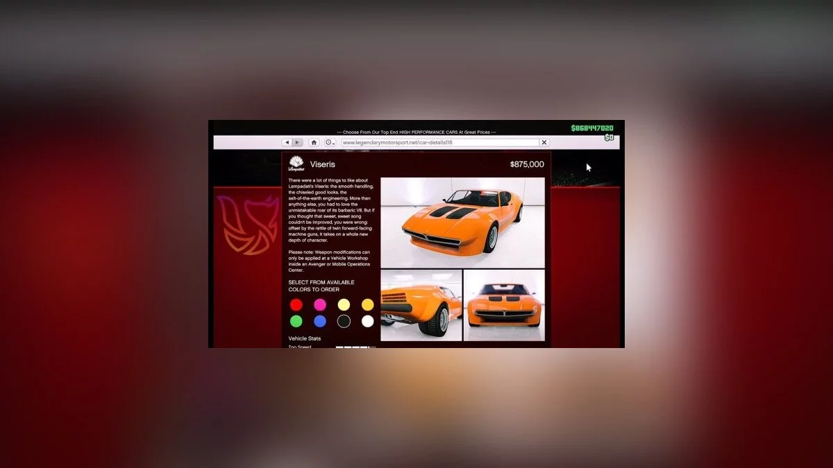 В ближайшее время Viseris станет доступен за ничтожные 875 тысяч игровой валюты. Это довольно мало для спортивного автомобиля в GTA V. Доступный через Legendary Motorsports, Viseris поставляется в различных цветах, а среди модификаций доступны передние двойные пулемёты. Его максимальная скорость — 235.7 км/ч.