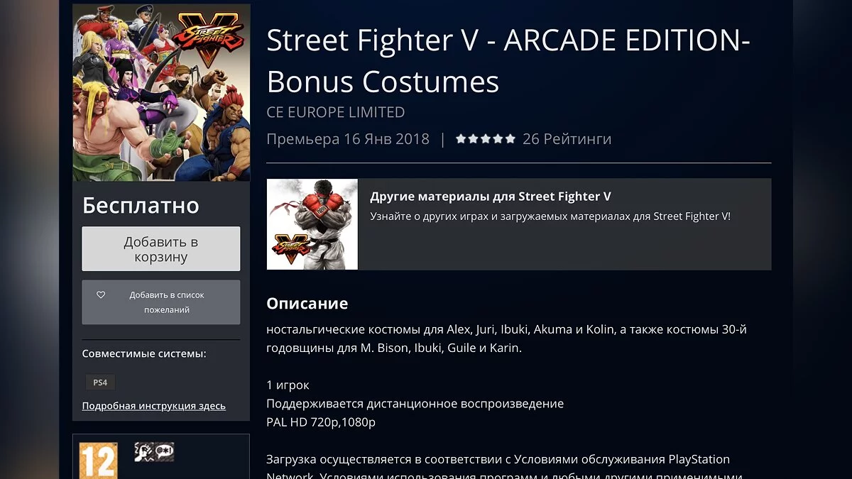 В Европейском PlayStation Store, включая российский и украинский, обнаружилась ошибка, из-за которой набор костюмов для Street Fighter 5: Arcade Edition можно получить бесплатно.
