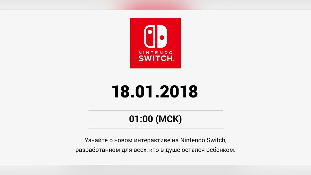 Анонс состоится 18 января в 01:00 (МСК). Вдобавок к информации об интерактиве, Nintendo сообщила, что готова удивить всех, кто в душе остался ребенком.