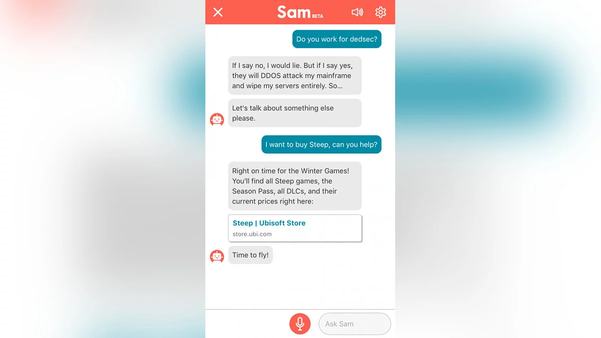 Как можно догадаться, вдохновителем Сэма была Siri. Это показывает его способность отвечать на основные запросы, сделанные с помощью текста или голоса. Он умеет рассказывать о происходящем в играх издателя и помогать с вопросами, связанными с этими тайтлами.