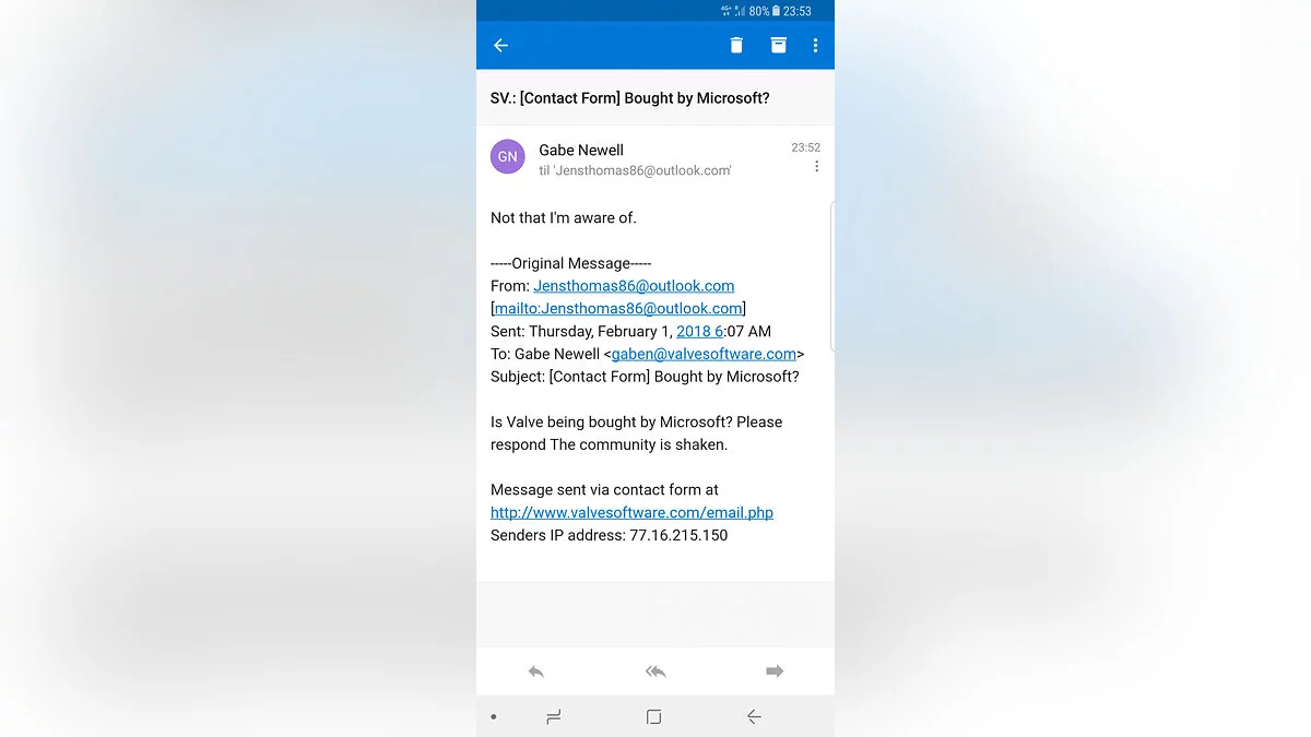 Ранее на этой неделе появились слухи о том, что Microsoft заинтересована в покупке Electronic Arts или Valve. И хотя в такой сценарий верится с трудом, основатель и генеральный директор Valve Гейб Ньюэлл (Gabe Newell) ответил фанату, который по электронной почте попросил его прокомментировать эти слухи.