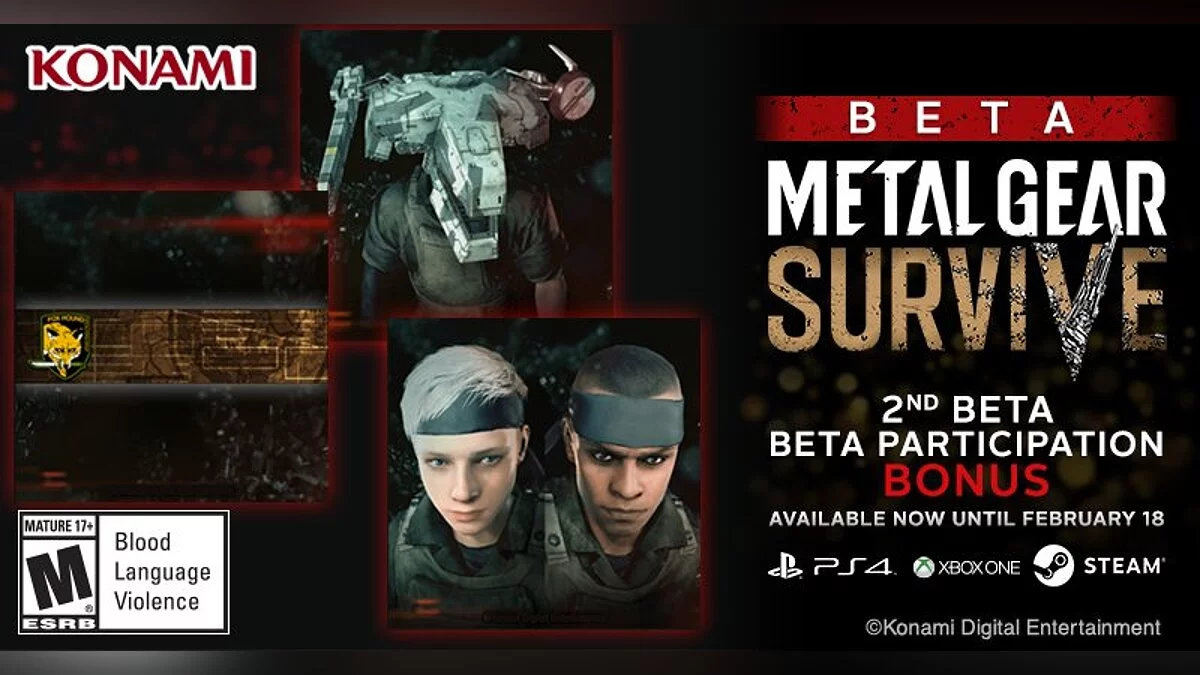 Бета-версия Metal Gear Survive будет включать в себя три миссии, две карты и кооператив на четырех игроков. Konami также предложит игрокам ежедневные миссии, доступные в рамках теста. Выход игры состоится 22 февраля на PC, PS4 и Xbox One.