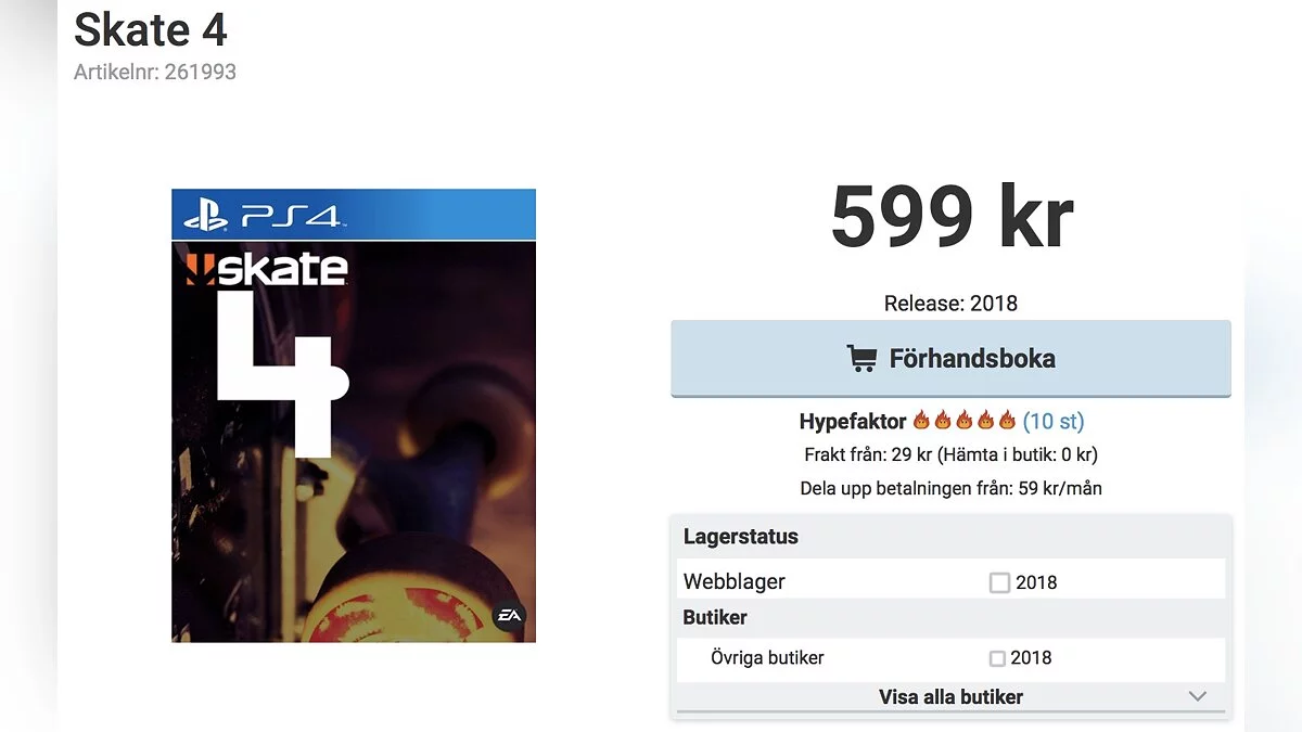 Шведский интернет-магазин Webhallen на странице аркадного симулятора скейтбординга Skate 4 установил дату выхода на 2018 год. Кроме того, магазин опубликовал изображение бокс-арта игры.