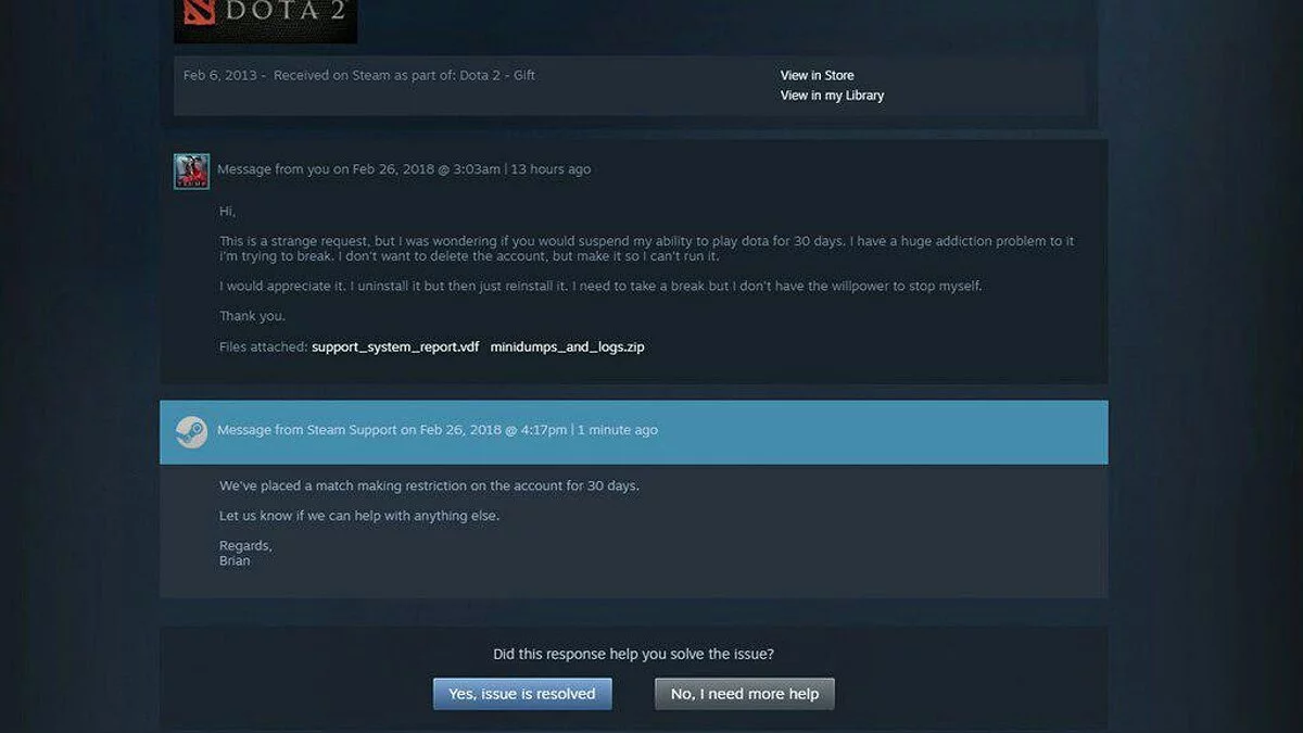Игрок написал, что у него серьёзные проблемы из-за привязанности к «Доте». Он пытался удалять игру, но её слишком легко скачать заново. Идти на крайние меры и лишаться аккаунта он не захотел, поэтому подумал, что, возможно, временный бан поможет.