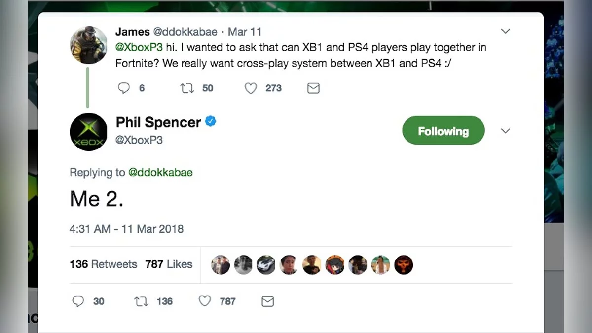 В последнее время кроссплей в Fortnite между PS4 и Xbox One обсуждается все чаще. В теме этого разговора даже поучаствовал глава Xbox-отделения Фил Спенсер (Phil Spencer), написав в Twitter, что как и множество геймеров, тоже хочет реализовать эту функцию. Поддержать Фила решила и компания Epic Games, которая также оказалась заинтересована в кроссплее между PS4 и Xbox One.