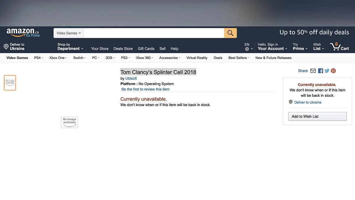 На официальной странице Ubisoft в известном онлайн-магазине Amazon появилась страница с игрой Tom Clancy's Splinter Cell 2018. Никакой другой информации об игре пока нет. Скорее всего, французская компания анонсирует продолжение культовой серии стелс-экшенов в ближайшее время.