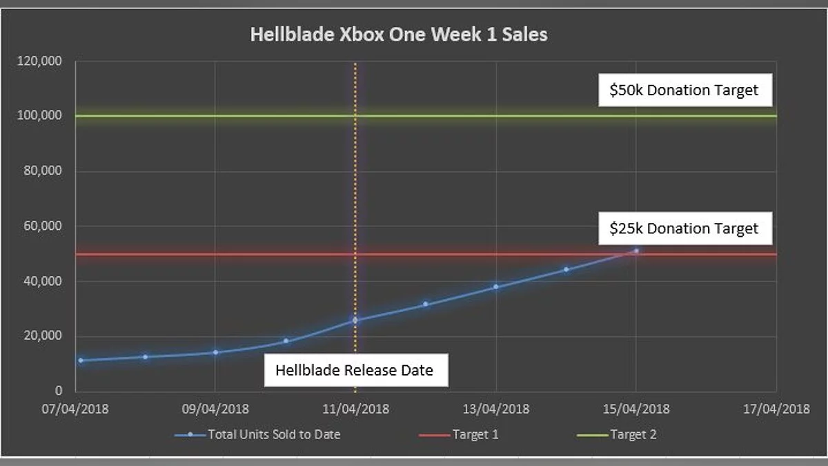 На прошлой неделе студия из Кембриджа заявила, что пожертвует $ 25 тыс., если продажи Hellblade: Senua's Sacrifice для Xbox One достигнут отметки 50 тыс. копий за первую неделю. Деньги будут перечислены на счёт некоммерческой организации Mental Health America.