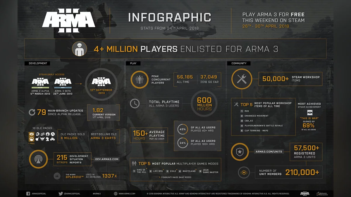 Недавно представители компании Bohemia Interactive рассказали о том, что количество игроков Arma 3 перескочило отметку в 4 миллиона. В честь этого знаменательного события игра будет доступна абсолютно бесплатно в течении пяти дней. Также разработчики опубликовали довольно интересную инфографику.
