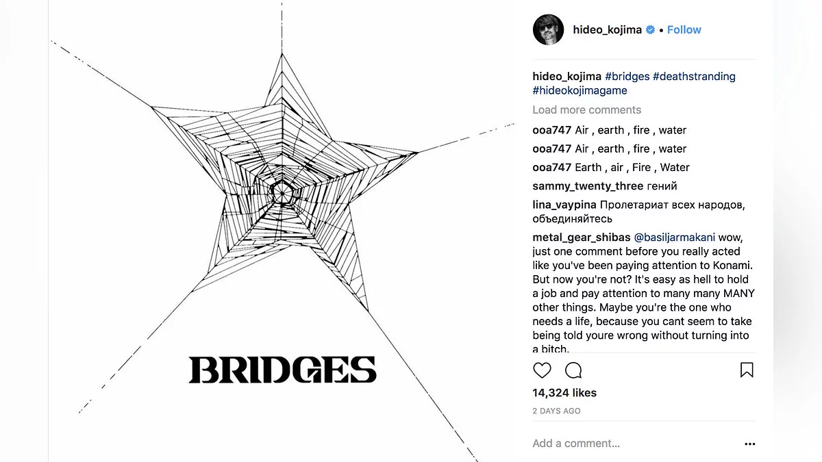 Недавно разработчик опубликовав на своей страничке в Instagram изображение паутины с логотипом «Bridges». Вероятно, Bridges является названием внутриигровой организации, в которой, по сюжету, будет состоять персонаж Нормана Ридуса (Norman Reedus). Логотип Bridges уже несколько раз появлялся в предыдущих тизерах, а поэтому он, судя по всему, играет важную роль во вселенной Death Stranding.